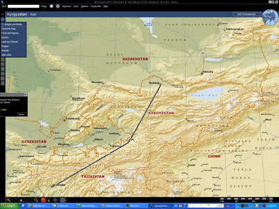 June, 2004 << Previous Leg || Next Leg >> So this past few trips we've been travelling throughout central Asia; today we're going to Tajikistan, yet another former member of the USSR. And we have a new plane! I've been using the default Beechcraft King Air 350, and now we're now going to use a slightly smaller plane, but constructed with more detail, the King Air B200 from FSS/Aeroworx with a United Nations livery. And the way to pronounce today's destination is not easy (as I've only just realised) because there is no vowel in the first part of the word. (pr. kergiSTAN)